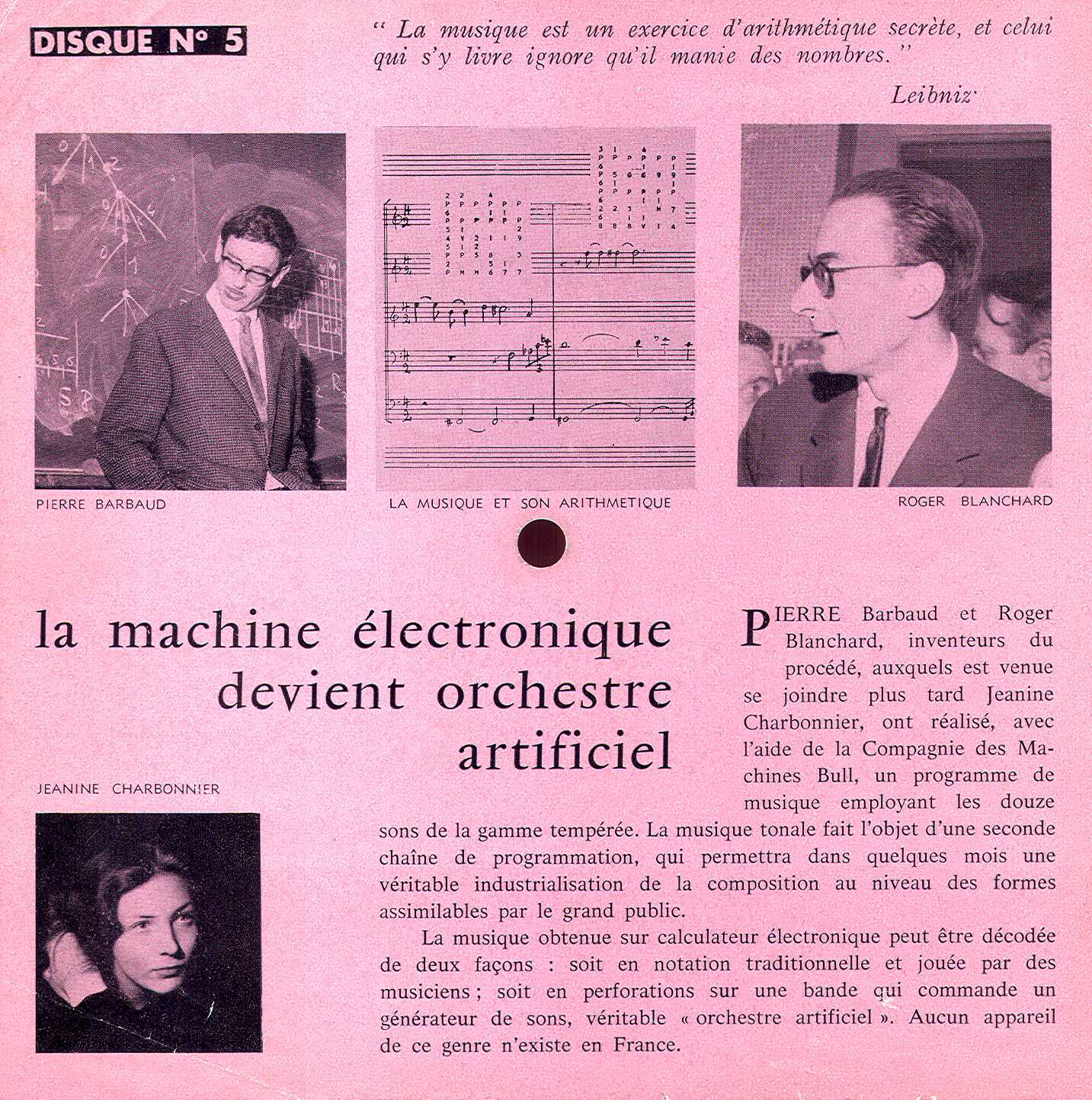 Roger Blanchard : « Je crois que les travaux pourraient nous conduire à établir à la machine par exemple tout le Debussy et tout le Mozart qui n'a jamais été écrit ». Extrait : Factorielle 7, joué au Festival de la recherche en 1960. Pierre Barbaud : « Il n'y a pas de robots, il y a des hommes, et des machines, et ces hommes se servent des machines ». Roger Blanchard : « Il y a un petit côté démiurge ». Extrait : Java, musique pour le film de Jean Rouch, Chronique d'un été.