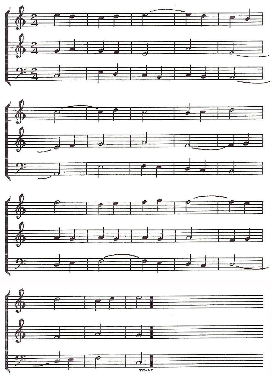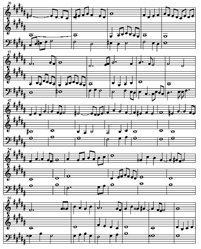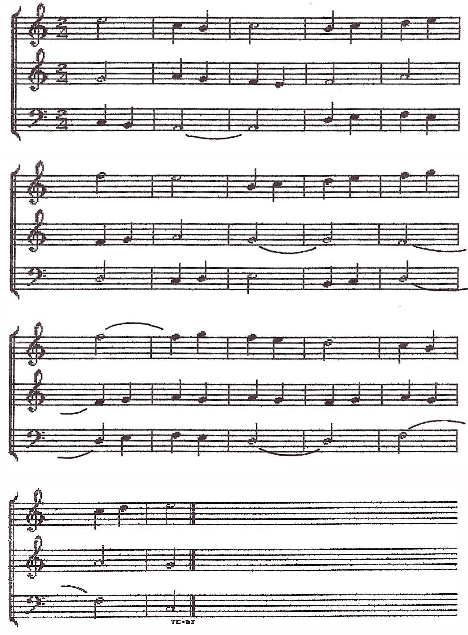 (harmonization examples)An example of a three part counterpoint computed by Pierre Barbaud. This file is the midi translation of the file entitled LCONT1.B3I, which is an original file coded in the format of the synthesis machine called Biniou. We are greatly endebted to Frank Brown (05 April 05, 1944 - Paris, January 22, 2012) a former teacher at the Université du Mans and a collaborator of Barbaud in the group BBK Barbaud-Brown-Klein (http://franck.brown.free.fr/Barbaud/) who gave us some copies of these original files. This sequence was played at a concert (March 14th, 1989) devoted to Barbaud. The automaton which computed the following example is partly described (in French) in: