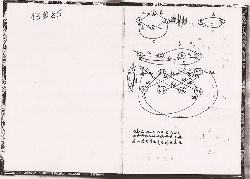 A copy of the page of Dan Timis notebook (Spring 1986) where he set up for the first time the construction of the synchronization automaton, and a letter by Stephen Travis Pope about the ICMC 88 paper by Chemillier and Timis.